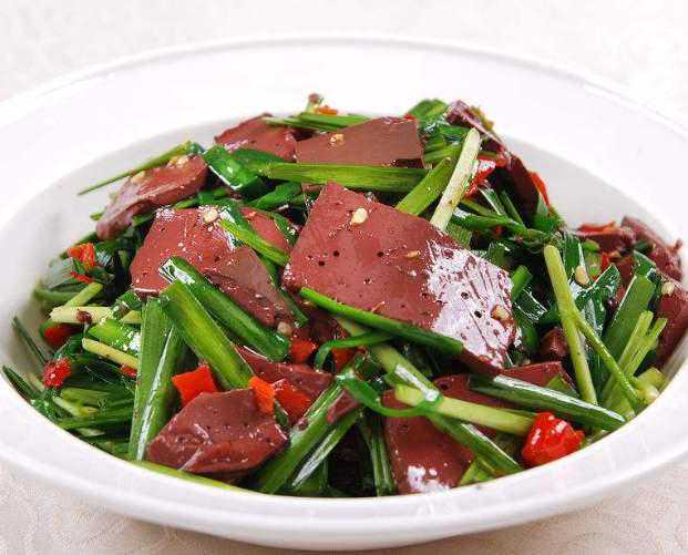 鸭血炒韭菜(鸭血50g,韭菜100g),含铁16.8mg、维生素C24mg