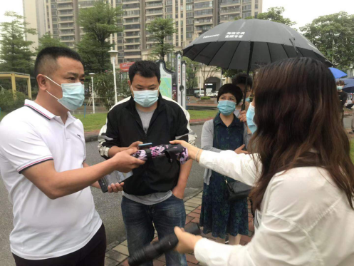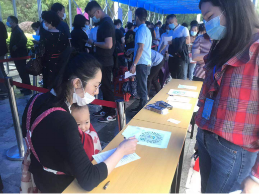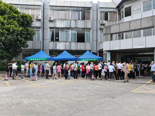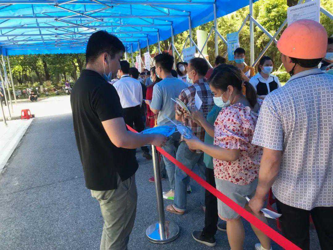 工作人员为排队群众派发扇子