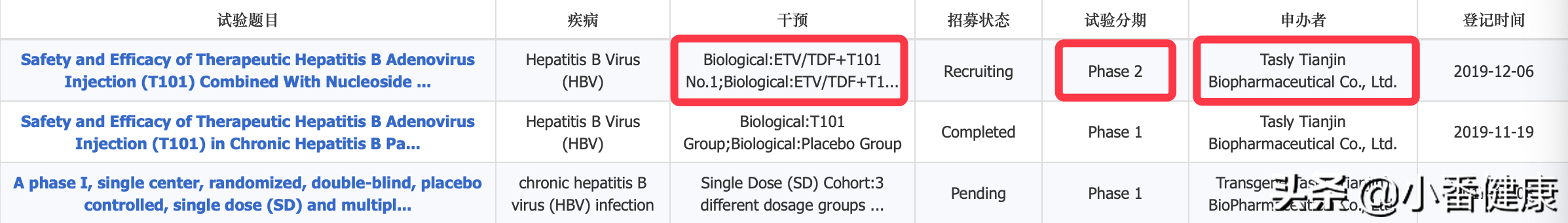小番健康结语:以上介绍的T101的II期临床试验是一项全球性的多中心、随机、开放标签、分组对照研究,登记于全球临床试验数据库中(见上图)。II期临床试验主要评估T101联合核苷酸类似物治疗慢性乙肝的安全性和有效性,如上所提,联合恩替卡韦或替诺福韦以及干扰素,该药为在研的一种治疗性乙肝疫苗,II期临床初步完成将在2020年12月,具体试验方法和内容已在上方公布。
