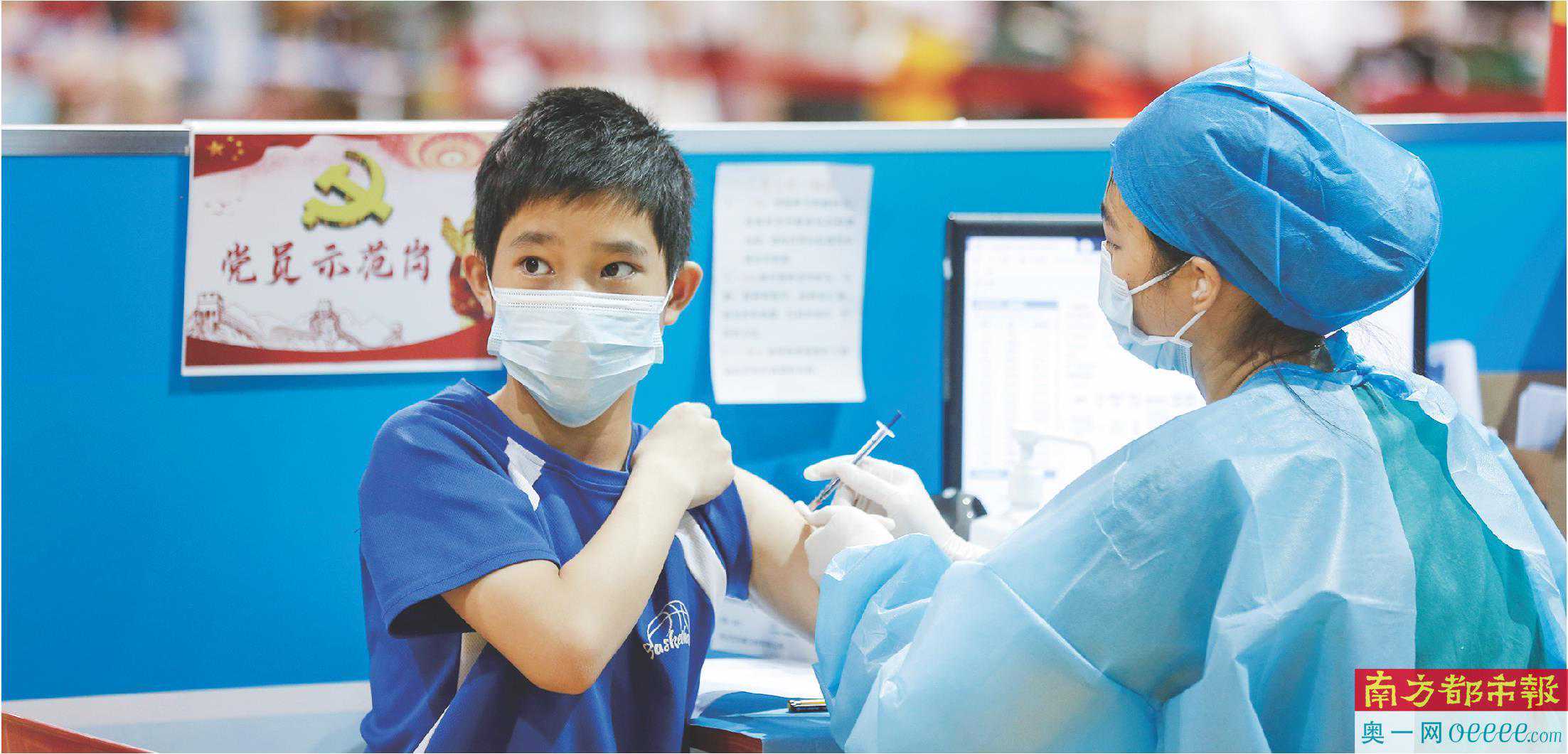在中山市体育馆新冠疫苗临时接种点,医护人员为学生接种疫苗。记者叶志文摄