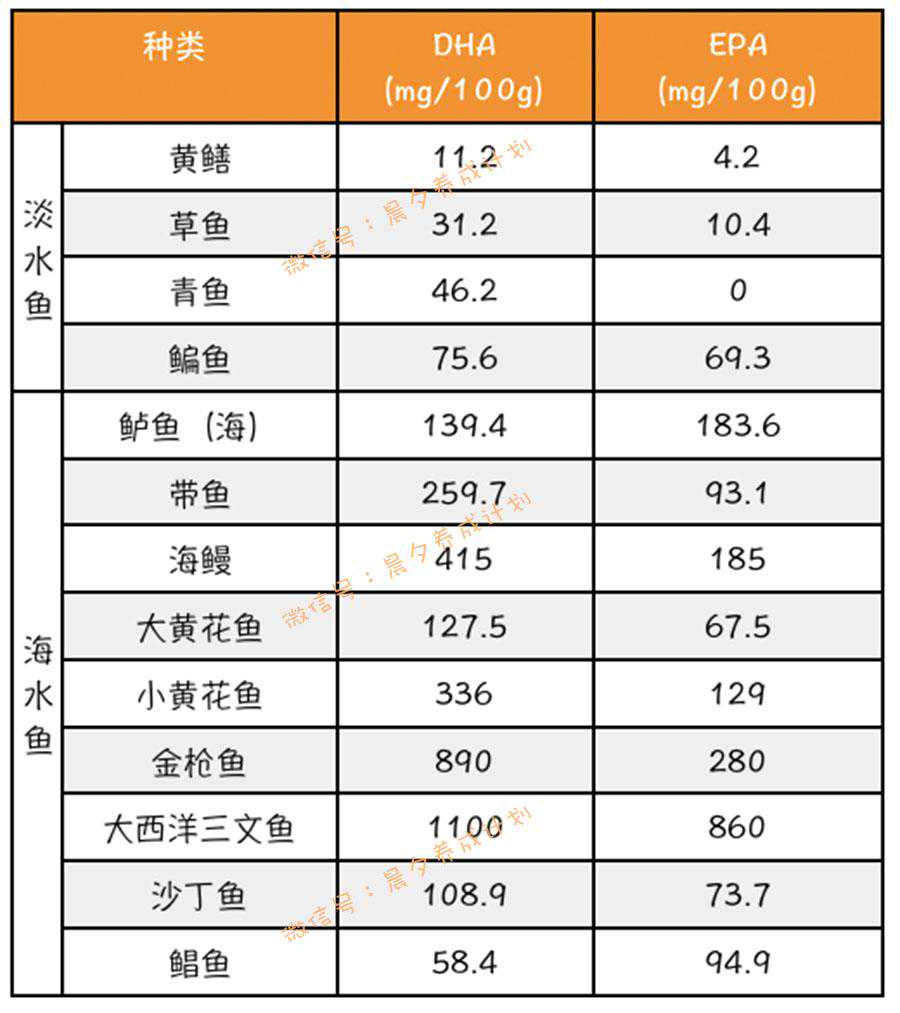 部分淡水鱼和海水鱼DHA和EPA含量参考