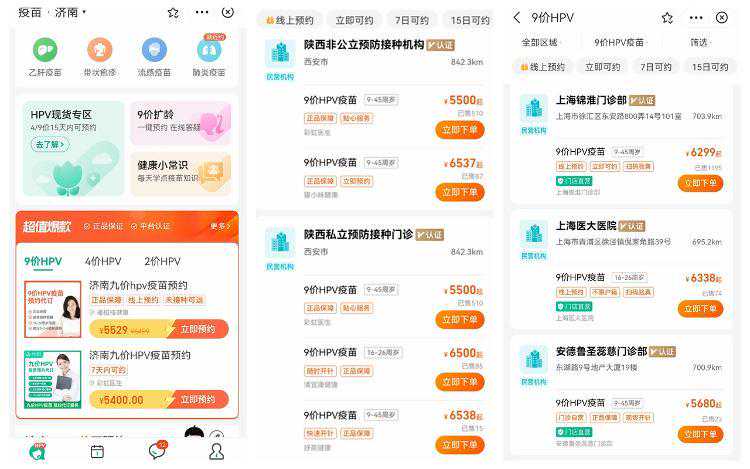 在某互联网预约平台上,上海、西安、济南等地九价HPV疫苗三针的价格在五六千元左右。