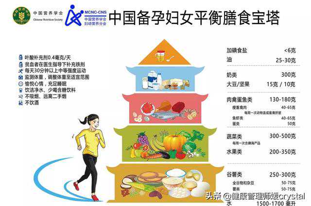根据中国营养学会《中国备孕妇女平衡膳食宝塔》的建议,女性在备孕期需要补充:
