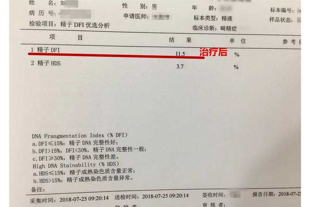 刘先生,也是女方多次流产,查DFI升高,经过两个月的治疗,DFI由27.5%下降到11.5%。