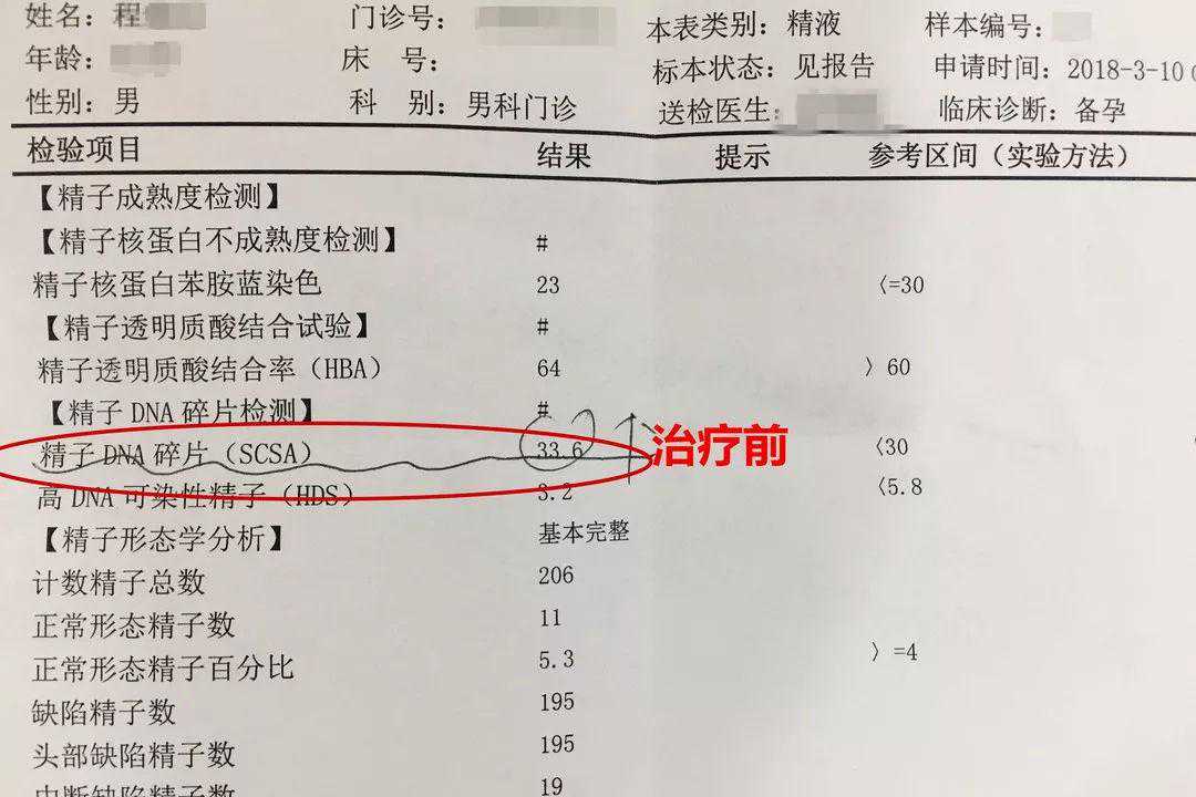 程先生,备孕2胎,几次试管均失败,查DFI提示33.6%,经治疗后,DFI由33.6%下降至19.5%!目前等在女方进一步治疗后备孕!