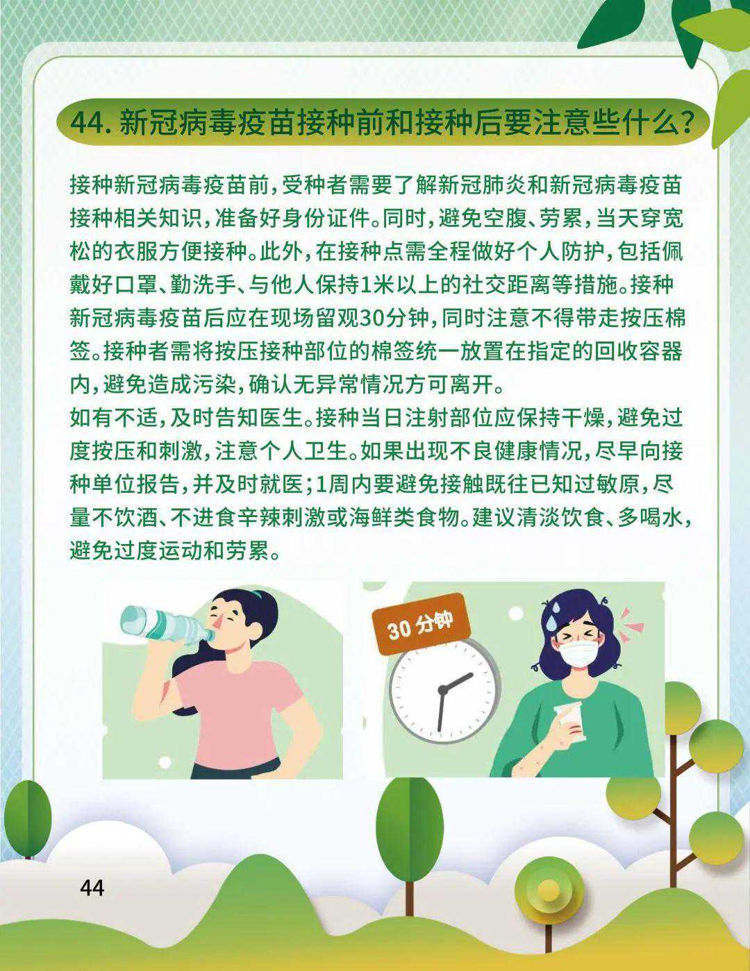 01接种新冠病毒疫苗前,受种者需要了解新冠肺炎和新冠病毒疫苗接种相关知识,准备好身份证件。同时,避免空腹、劳累,当天穿宽松的衣服方便接种。